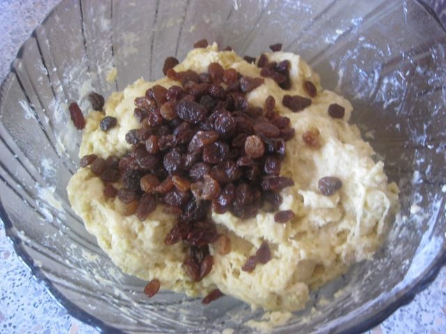Засыпать подготовленный изюм, равномерно распределяя, вмешать в тесто.