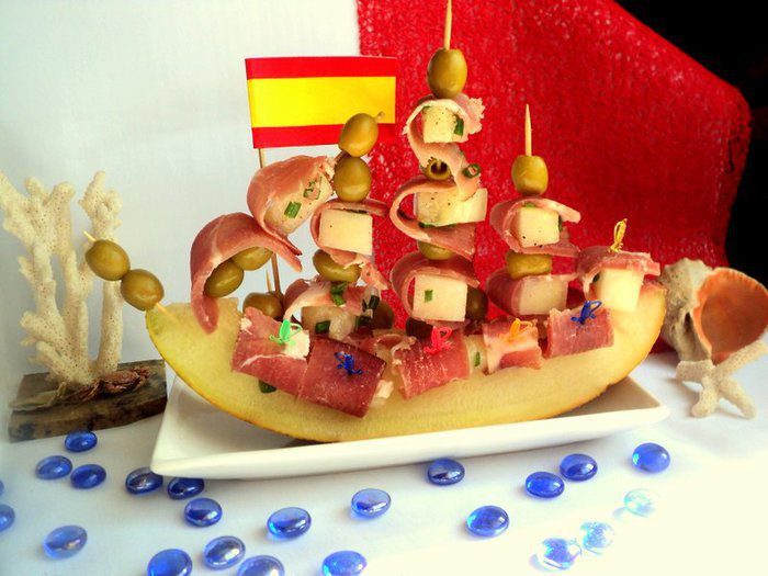 Хамон нарезать тонкими полосками. Обернуть кусочек дыни пластинкой хамона и закрепить шпажкой. Я оформила подачу закуски в виде парусника, дополнительно украсив блюдо оливками. Приятного аппетита!