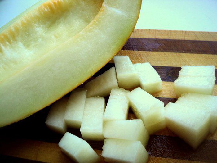 Дыню очистить от семян, отрезать несколько долек и порезать на кусочки. Часть дыни оставить, это будет наш корабль.