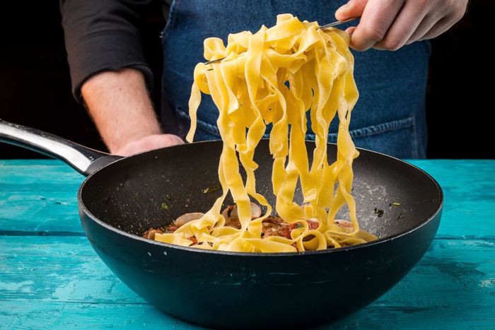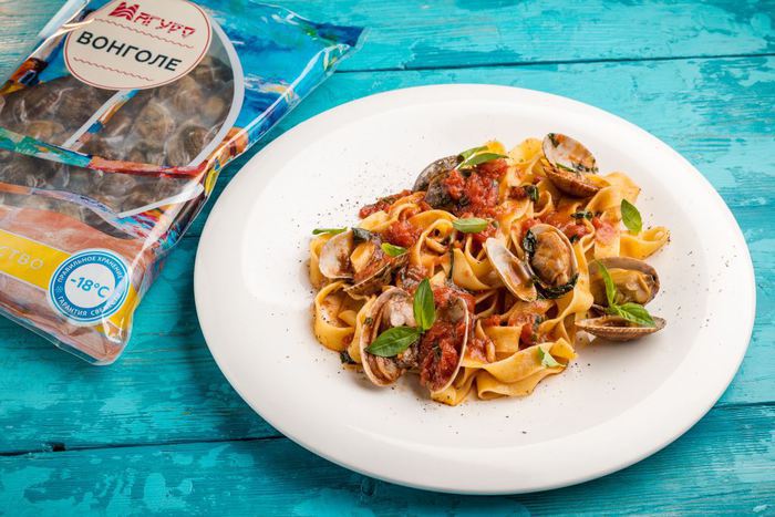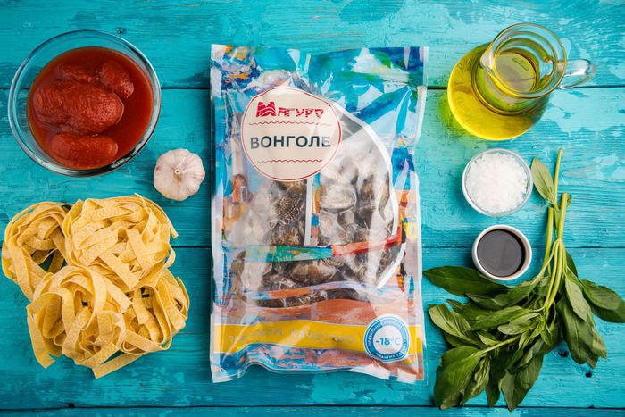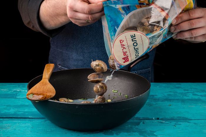 Добавьте в сковороду моллюски вонголе ТМ «Магуро». Поджарьте в течение 3 минут, чтобы все ракушки открылись.