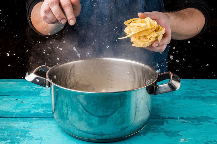 Добавьте соль по вкусу и готовую пасту в сковороду. Все перемешайте, прогрейте в течение 1 — 2 минут и снимите с огня.