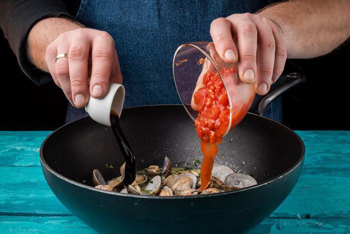 Влейте бальзамический уксус, перемешайте вонголе и сразу добавьте измельченные помидоры в собственном соку.