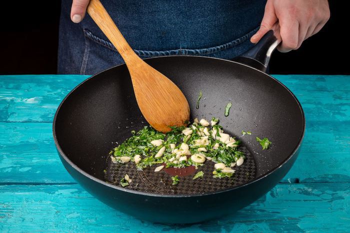 Измельчите чеснок и нарежьте базилик. В сковороде нагрейте оливковое масло, добавьте чеснок и базилик. Обжарьте до золотистого цвета чеснока.
