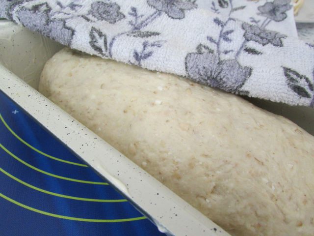 Затем добавьте оставшуюся муку (может быть, понадобиться чуть больше муки), всыпьте овсяные хлопья, влейте подошедшую опару и замесите тесто.