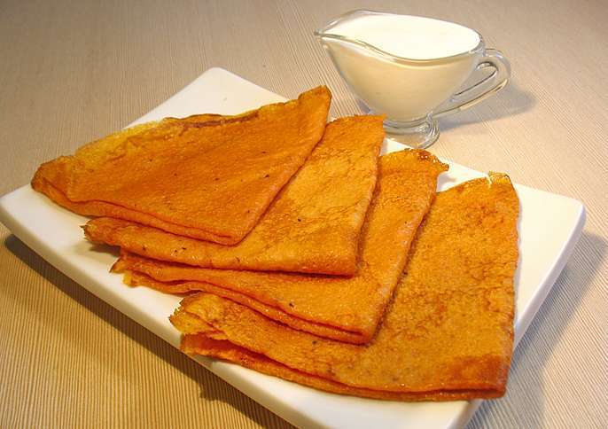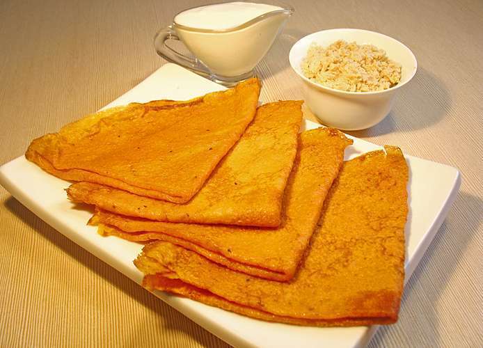 Хочу поделиться с вами несладким вариантом блинов. Это солнечные - томатные блины. Они изумительны. Мягкие, сочные с томатным вкусом. Великолепно сочетающиеся с начинкой из мяса, картошки, капусты…. Я подавала с куриным муссом и сметаной