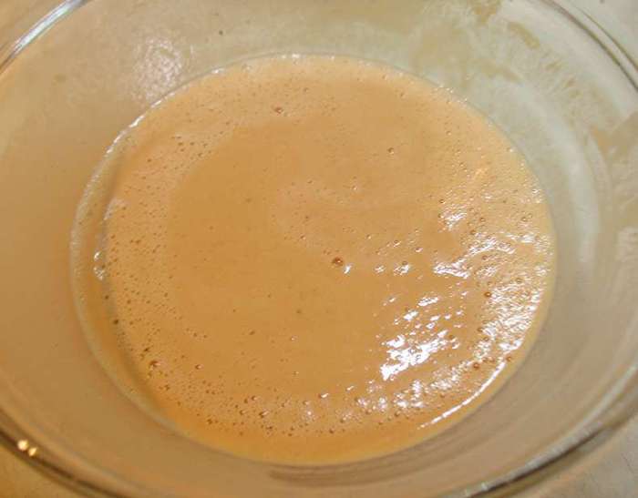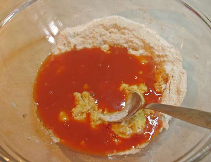 К томатному тесту добавить кипящее молоко и растительное масло. Хорошо перемешать и оставить минимум на 5 минут.