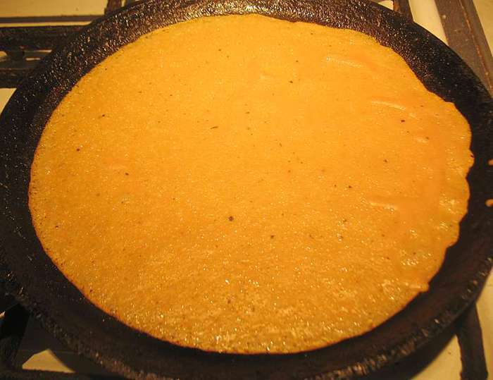 Разогреть сковороду, первый раз смазать растительным маслом. Вылить порцию теста и распределить ее по всей поверхности сковороды. Выпекать блины с двух сторон до готовности.