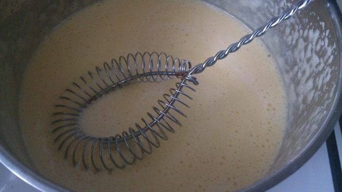 Яйца взбить с сахаром, влить сливки и поставить на медленный огонь. Постоянно помешивать.