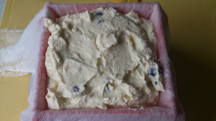 Форму для пасхи выстелить влажной марлей. Выложить творожную массу, прикрыть марлей и поставить сверху гнет. Выдержать в холодильнике желательно в течении суток.