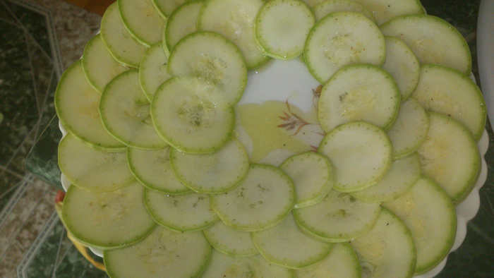 Кабачок (кстати, цукини будет ничуть не хуже), режем тонкими кружочками, где-то по 1-2 мм толщиной, а там как получится. Можно воспользоваться каким-нибудь слайсером, но мне нравится просто ножом, так сказать "hand made")))