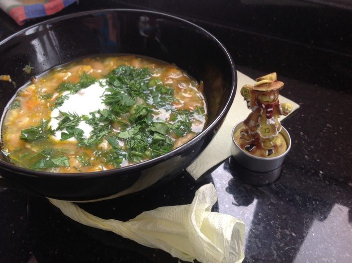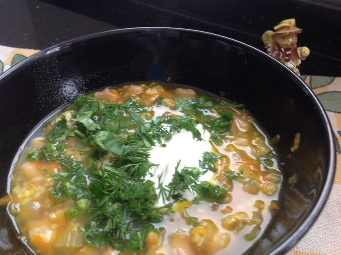 Разлить суп по тарелочкам, добавить мелко рубленную зелень и 1 столовую ложку сметаны.