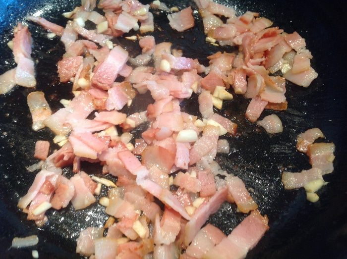 Бекон нарезать, чеснок измельчить и обжарить на той же сковороде, где готовились овощи.