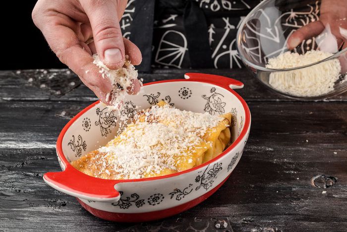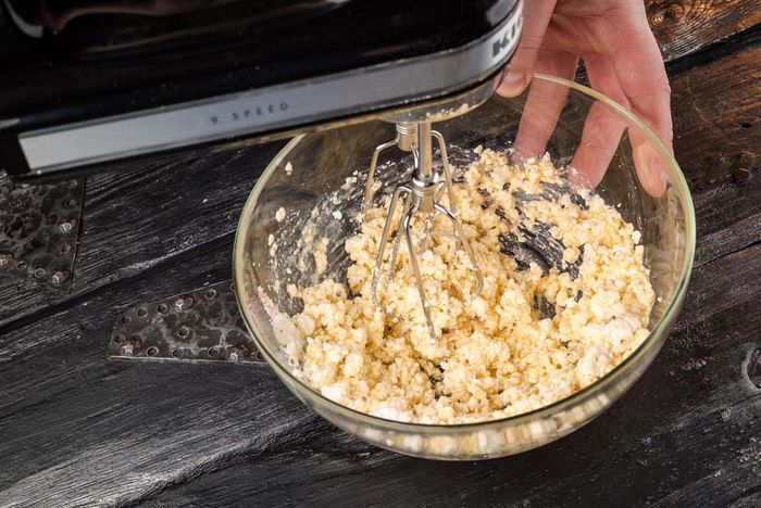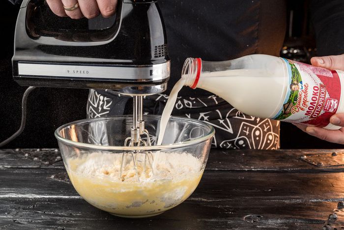 Духовку предварительно разогреть до 190°С. Приготовить тесто: соединить предварительно размягченное сливочное масло «Домик в деревне», яйцо, 1 ч. л. сахара, щепотку соли и взбить все миксером. Не прекращая взбивать, ввести половину муки затем тонкой струйкой влить немного молока «Домик в деревне». Как только масса станет однородной, ввести оставшуюся муку и молоко и еще немного взбить тесто.