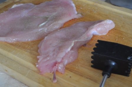 Куриное филе (у меня 2 больших куска по 200 гр каждый) помыть, обсушить и отбить, посолить и поперчить.