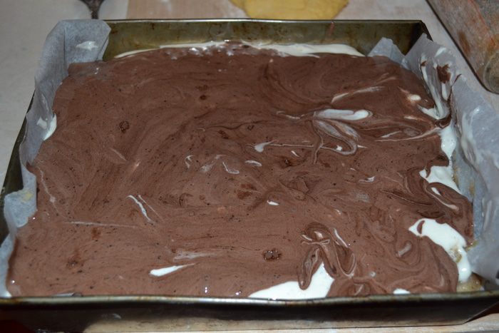 Далее на яблочный слой выкладываем белое тесто, на него аккуратно тесто с какао. Чтобы получить подобие волн, протыкаем в нескольких местах шоколадное тесто вилкой и немного встряхиваем форму с пирогом.