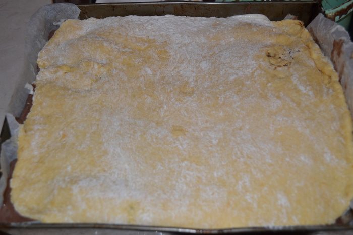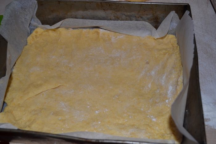 Одну часть теста раскатываем и выкладываем в форму для выпекания, размером примерно 25*35 см.