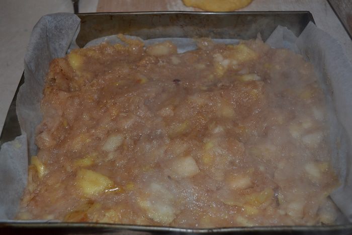 В форму для выпекания на тесто №1 выкладываем яблочную начинку.