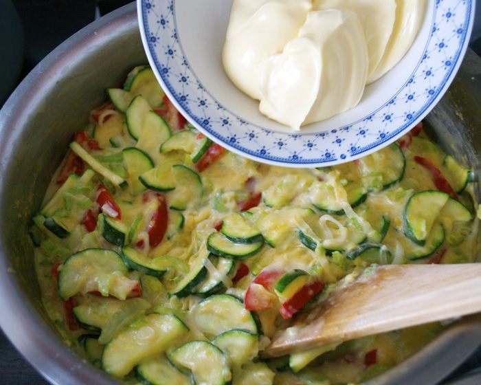 Снять с огня и добавить майонез (у меня свой, домашний), 2/3 тертого сыра, посолить и поперчить по вкусу.