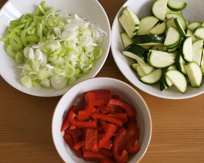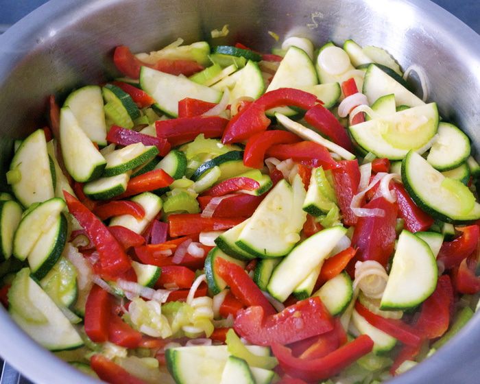 Нагреть духовку до 200 С. Разогреть оливковое масло в большой сковороде и обжарить сельдерей, красный перец, кабачок и зеленый лук на умеренном огне около 5 минут.