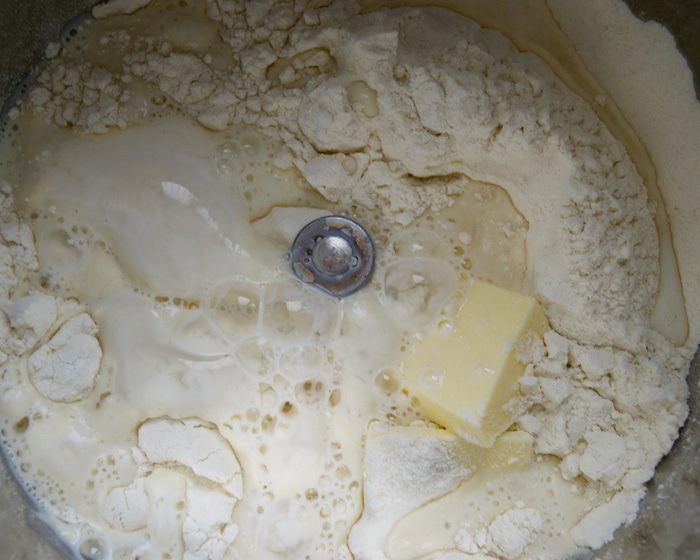 Просеять в миску муку, разрыхлитель и соль. Растереть со сливочным маслом, влить молоко и вымесить мягкое тесто. Я все это сделала в чаше миксера! )))