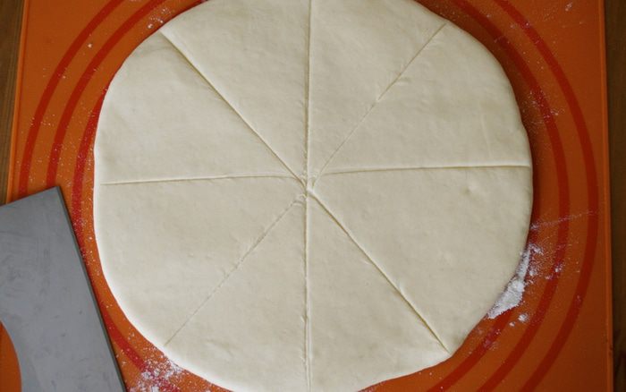 Окончательно вымесить тесто на присыпанной мукой доске, затем раскатать в форме круга толщиной 1,3 см. Разрезать круг на 8 клиньев...