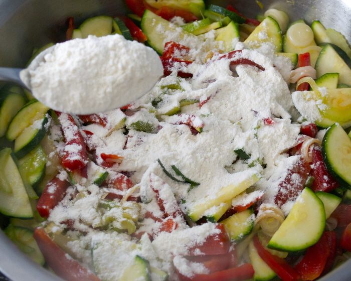 Всыпать к овощам пшеничную муку и обжаривать ее в течение 1 минуты.