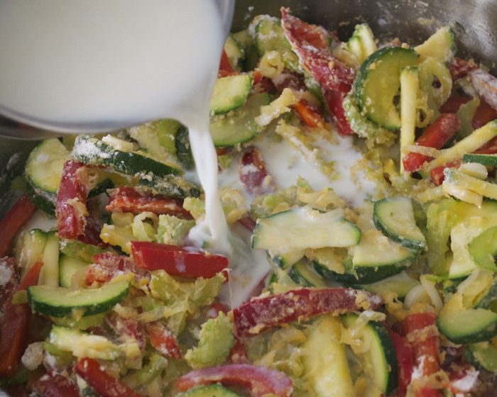 Затем постепенно влить молоко... Варить, помешивая, пока смесь не загустеет.