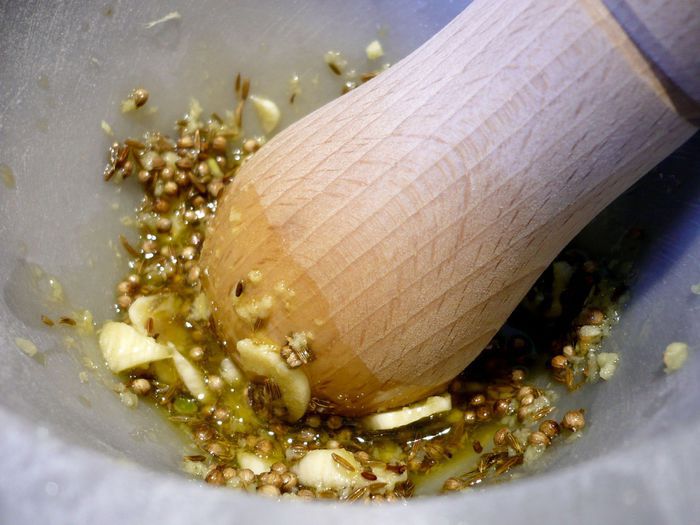 Приготовим приправы. В ступке разотрем нарезанный тонкими кружочками чеснок с натертым имбирем (кусочек величиной с грецкий орех), кориандром и зирой, добавив 2 ст.л. оливкового масла.