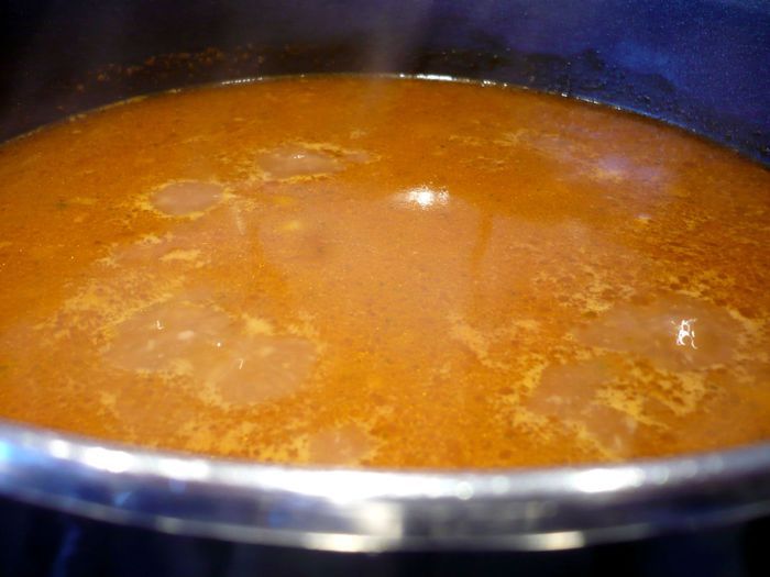Переложим фарш в кастрюлю, зальем горячим бульоном и оставим вариться в течение 45 минут на маленьком огне.