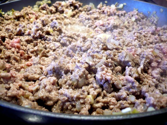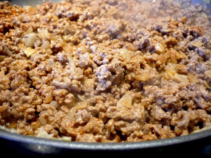 Лук очистим и порежем мелко. В сковороде разогреем оливковое масло и поджарим лук до прозрачности. Добавим фарш и, помешивая, прожарим его практически до готовности. Посолим и поперчим. Пассеруем томаты.
