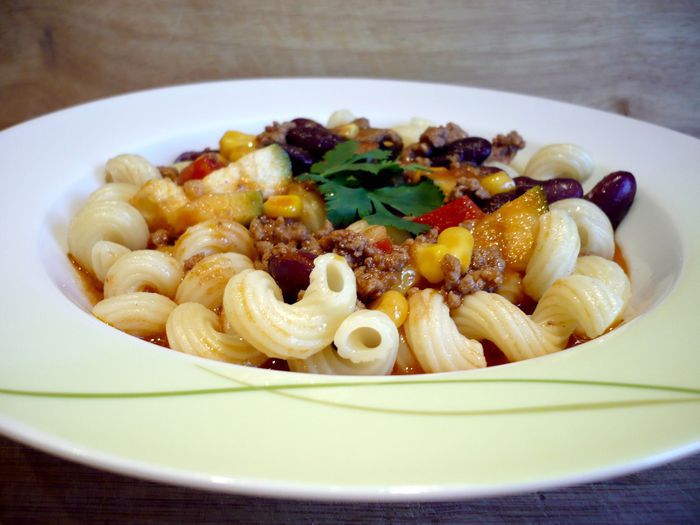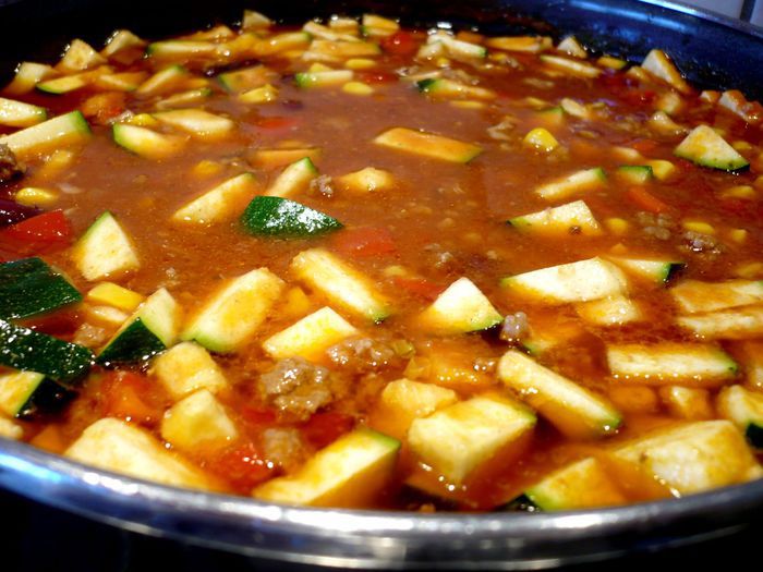 Введем пасту в суп, добавим порезанные небольшим кубиком цукини и паприку, а также фасоль и кукурузу (и то и другое без жидкости) и остальные томаты. Перемешаем и поварим еще 15 минут.