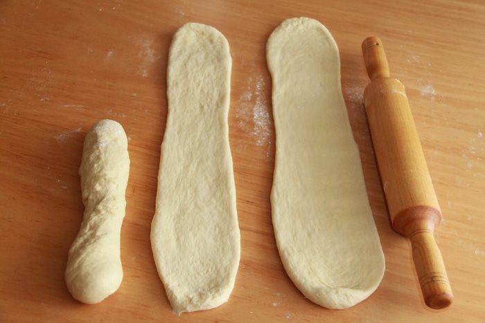 Через час тесто разделить на три равные части (для совершенной точности взвешиваю куски), сформировать три колбаски-жгутика.