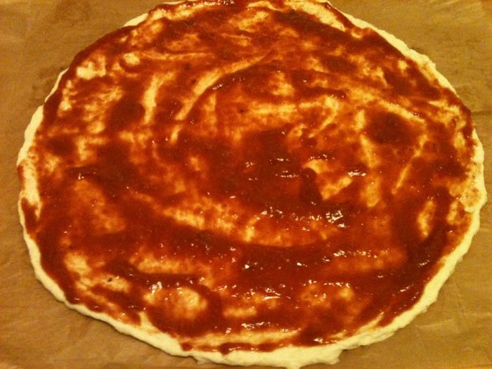 Смазать томатным соусом (идеально из консервированных томатов в собственном соку).