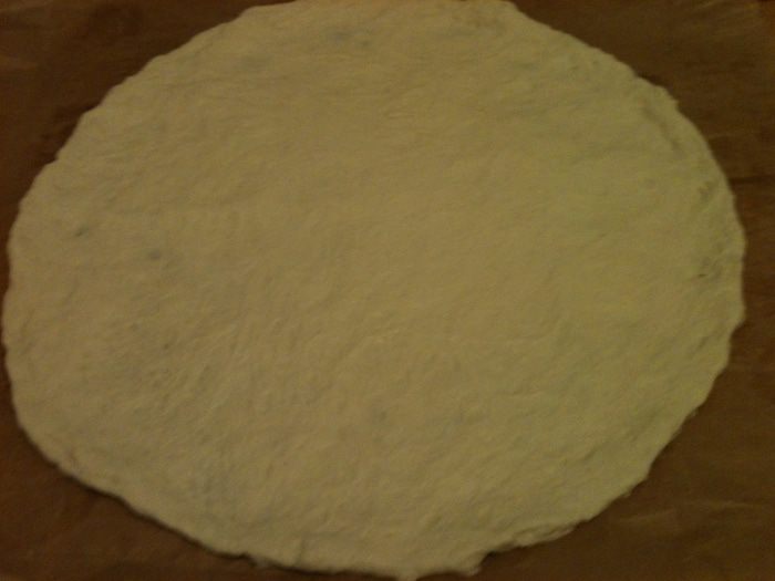 Тесто я готовлю в хлебопечке на режиме "Тесто для пиццы". Готовое тесто растянуть как можно тоньше. Я его растянула на пекарской бумаге.