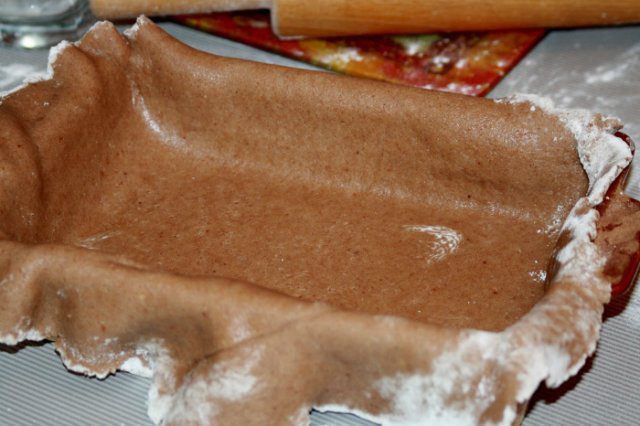 Форму смазать маслом. Постелить на стол пергамент (или пищевую пленку) и раскатать на нем тесто очень тонко! Толщиной 2 мм. После этого одним резким движением перевернуть тесто на форму и аккуратно его в ней уложить. Края обрезать.