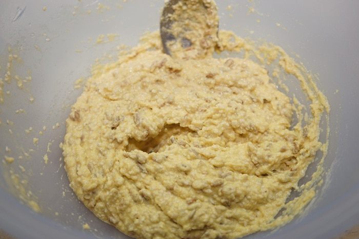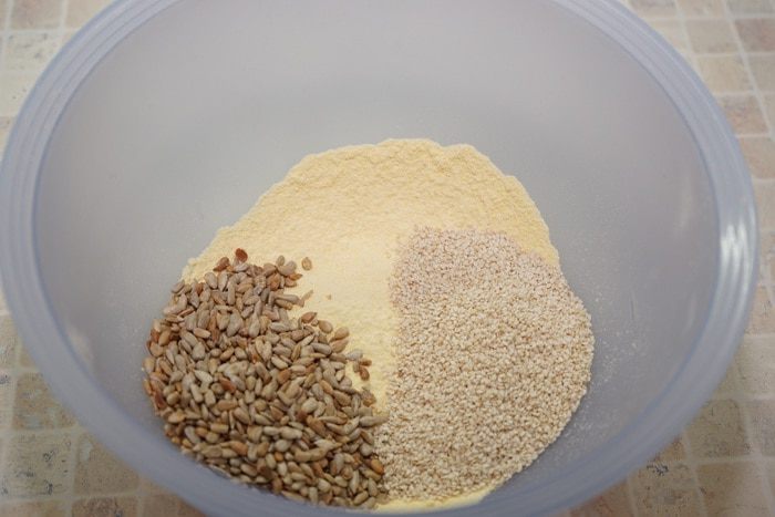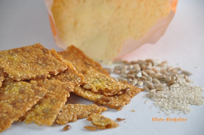 На противень постелить бумагу для выпечки (у меня тефлоновый лист), выложить тесто и аккуратно раскатать как можно тоньше – примерно 2 мм. Тесто очень липкое и можно раскатывать его между двумя листами для выпечки. Ножом нанесите бороздки для разделения кусочков, чтобы по ним потом разломать хлебцы. Посыпать крупной солью.