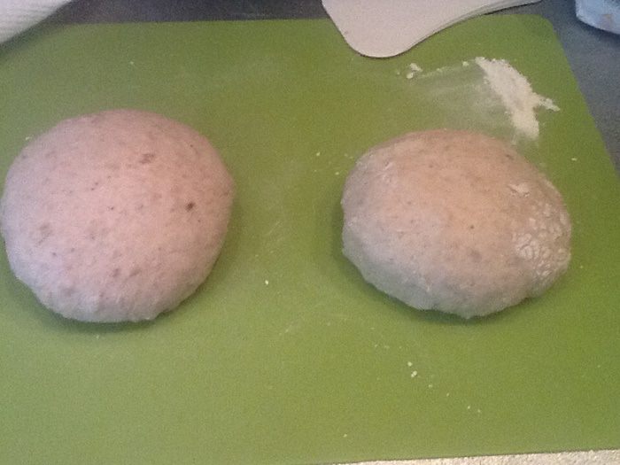 Подошедшее тесто выкладываем на стол,делим на две части,каждую скатываем в шар,накрываем полотенцем,оставляем на 10 минут.