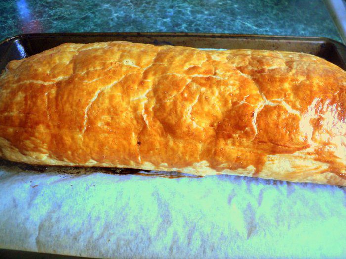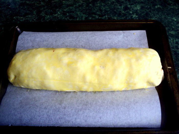 Свернуть рулет. Края защипнуть. Верх рулета смазать желтком.