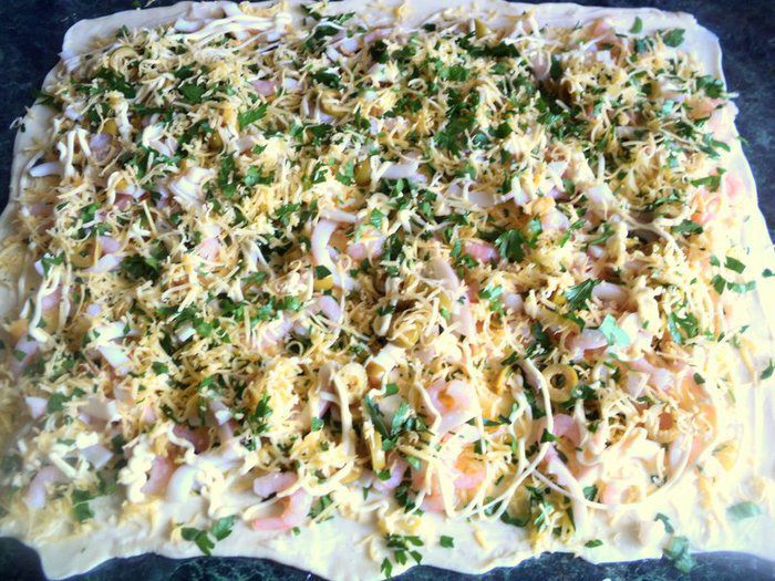 Предлагаю Вам приготовить пикантный рулет из слоеного теста с морепродуктами и оливками. Из морепродуктов я брала креветки и кальмары, но по желанию можно добавлять и другие морепродукты или взять морской коктейль.