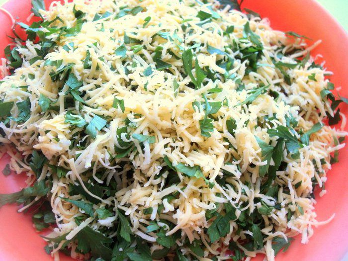 Сыр потереть на терке, петрушку мелко порезать. Смешать сыр и петрушку.
