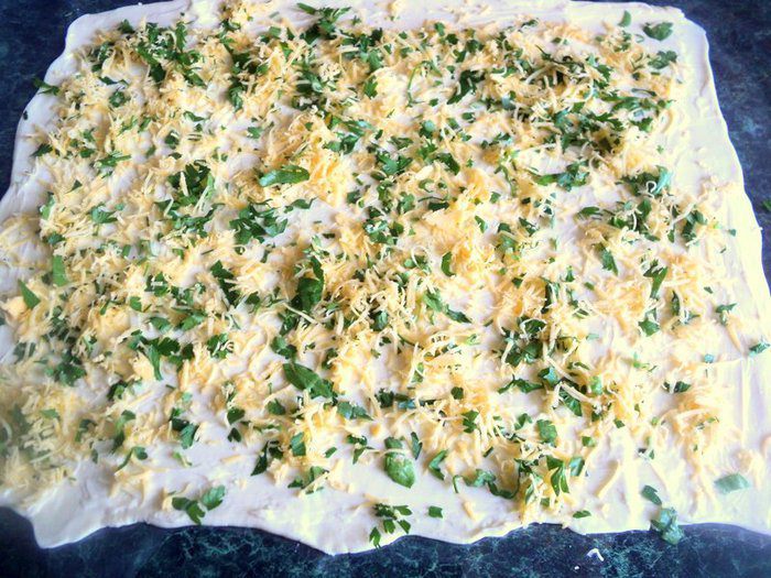 Слоеное тесто разморозить и раскатать в пласт толщиной 3-4 мм, смазать майонезом.