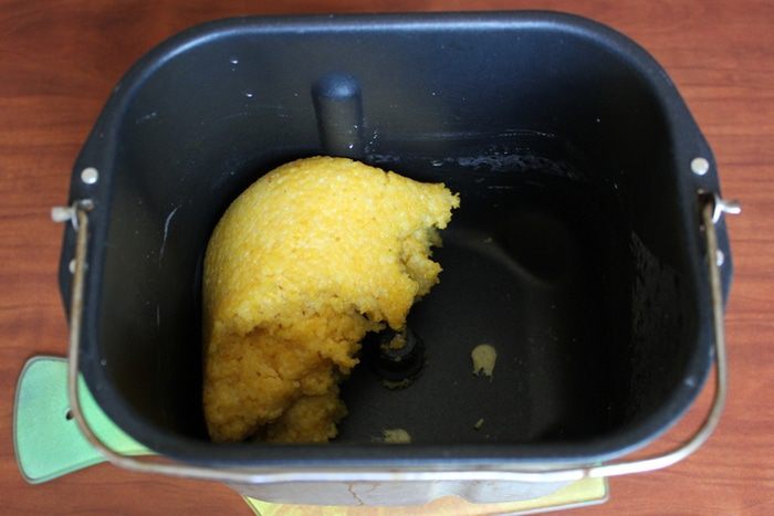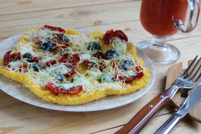 Готовую горячую поленту распределите по силиконовым формам или на противень. У меня получилось две такие формы, как на фото. Разложите на поверхности поленты вяленые помидоры, половинки маслин, посыпьте сухими итальянскими травами. Сыры натрите и порциями укройте поверхность кукурузной поленты. Поместите в разогретую до 200 градусов духовку и нагрейте до расплавления сыра.