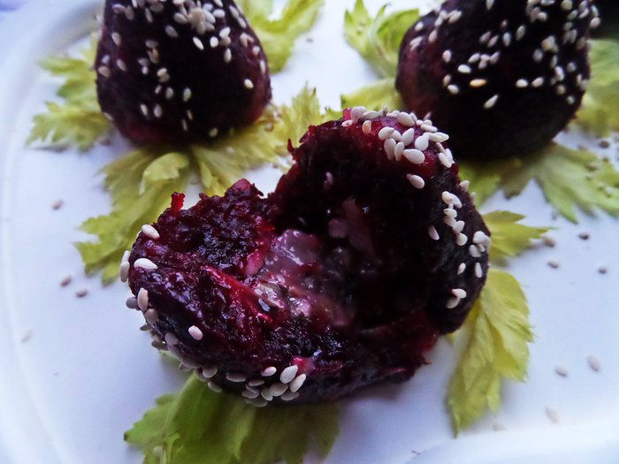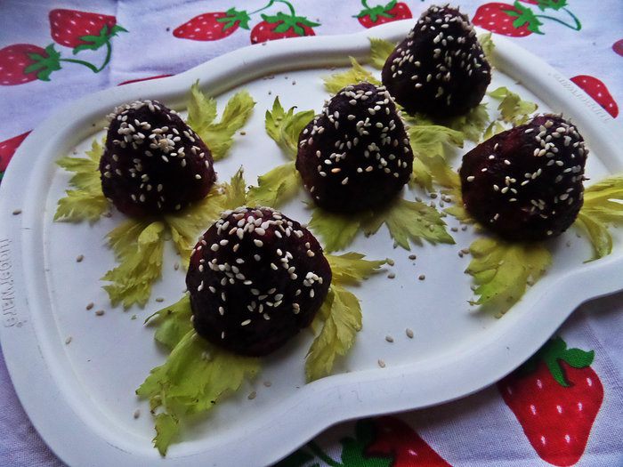 В центр положить чайную ложечку начинки. Залепить в виде ягодки.