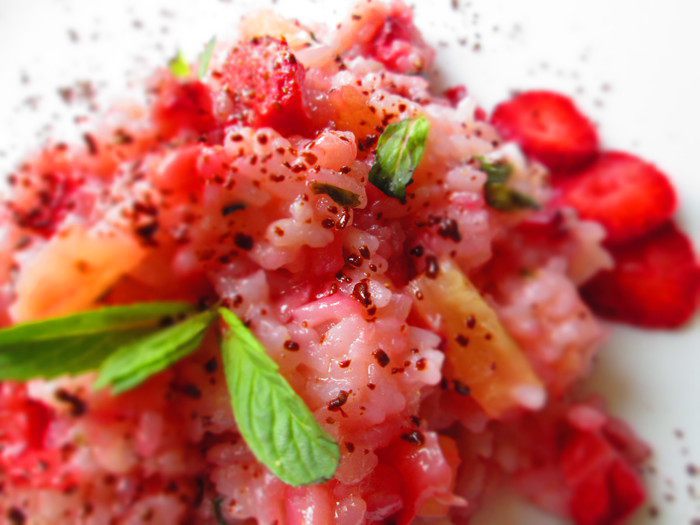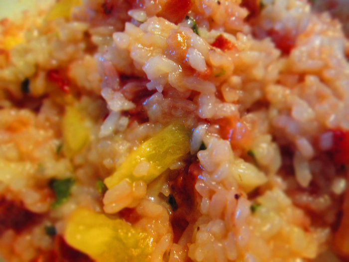 В сотейнике распускаем масло и прогреваем мяту 2 минуты, затем засыпаем промытый рис, вливаем вино и готовим до выпаривания жидкости, а затем