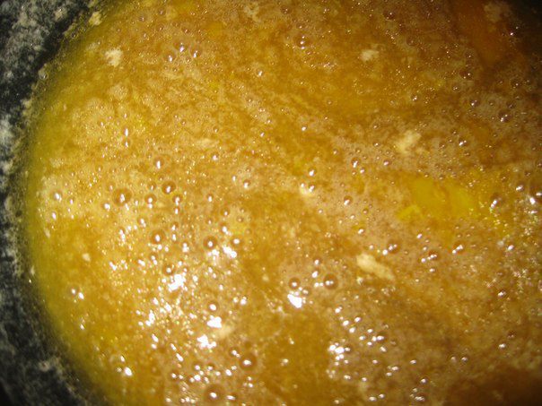 Насыпаем половину сахара на горячую сковородку. Растапливаем его, постоянно помешивая 2-3 минуты.