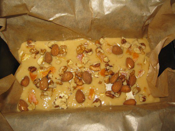 Форму высылаем пекарской бумагой. Выливаем туда тесто. Нарезаем цукаты. Добавляем орехи.