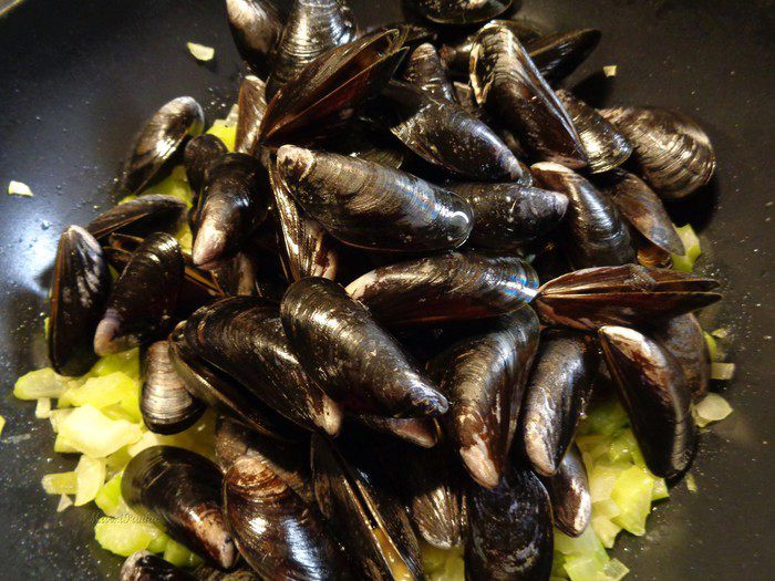 Мидии тщательно вымыть, поврежденные раковины выбросить. Добавить мидии к овощам и перемешать.