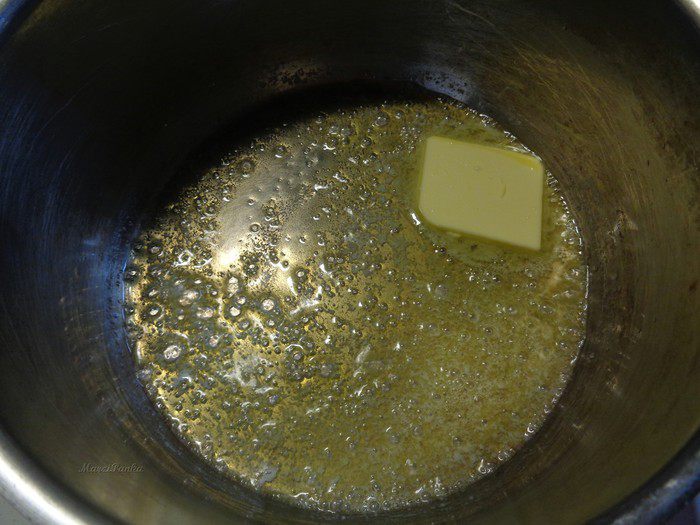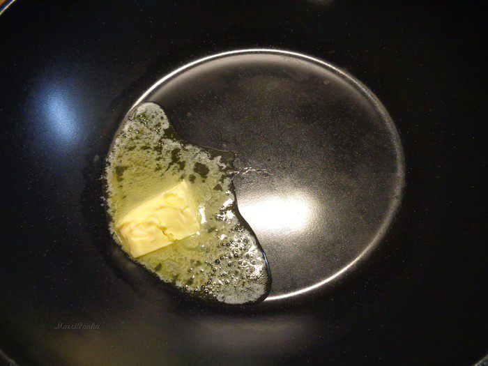 В большой сковороде (или кастрюле) растопить 30 гр. сливочного масла.