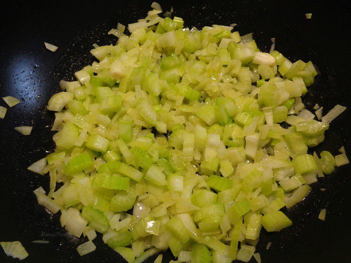 Добавить в сковороду лук и порей, а также порезанный сельдерей. Обжарить овощи.