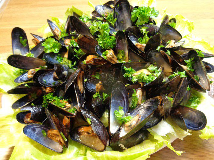 Залить мидии соусом и посыпать рубленой зеленью петрушки. Подавать на блюде, используя листья салата в качестве подложки.